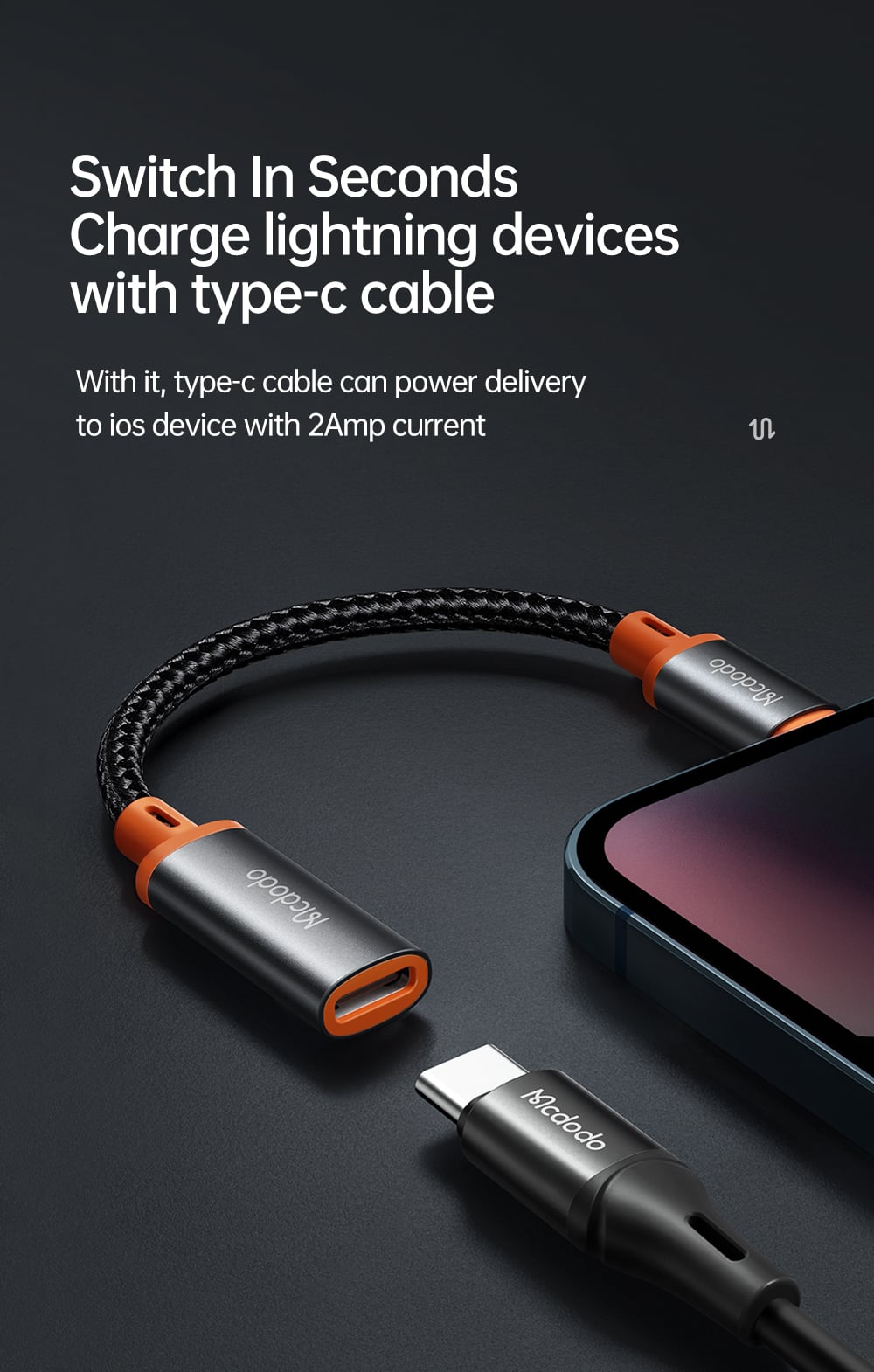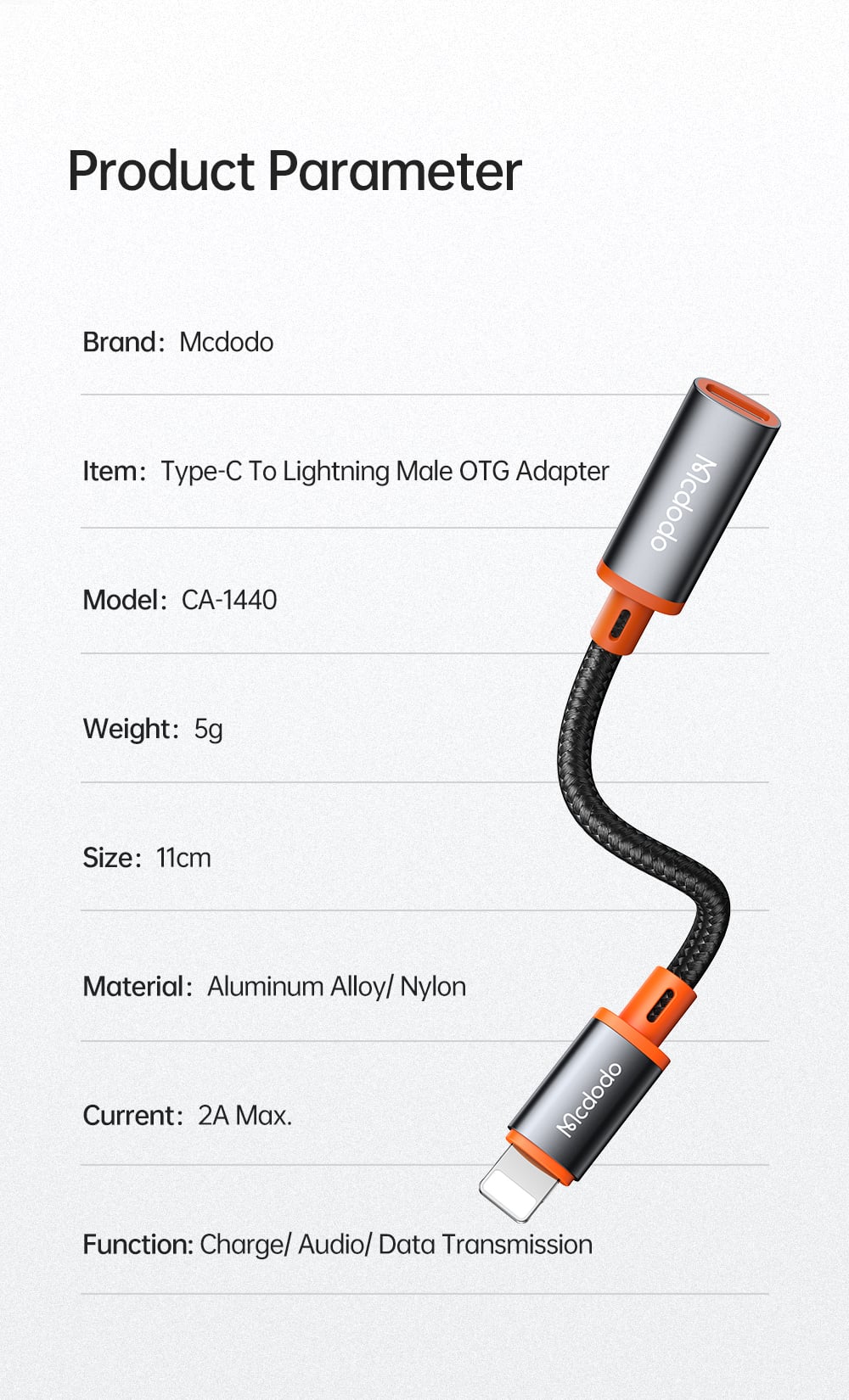 Series Name: Castle Series Product Name: Type-C to Lightning Convertor Cable Material: Aluminum alloy + nylon Features: Convert USB-C peripherals, Charging & data sync, Support OTG audio headphone Product size: 32.48*15.25*10.05mm Weight: 10g