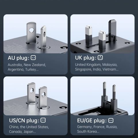 - Chuyển đổi linh hoạt: Chỉ cần thao tác gạt và đẩy nhẹ nhàng, bạn có thể thay đổi chân cắm để phù hợp với ổ điện tại bất kỳ quốc gia nào bạn đặt chân đến.