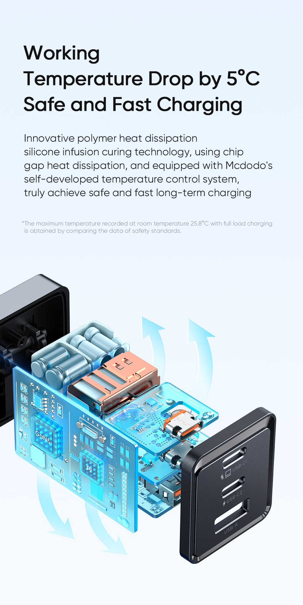 - Hiệu suất cao - Nhiệt độ thấp: GaN5 giúp giảm thiểu thất thoát năng lượng và tỏa nhiệt ít hơn, giữ cho củ sạc luôn mát mẻ ngay cả khi hoạt động hết công suất.