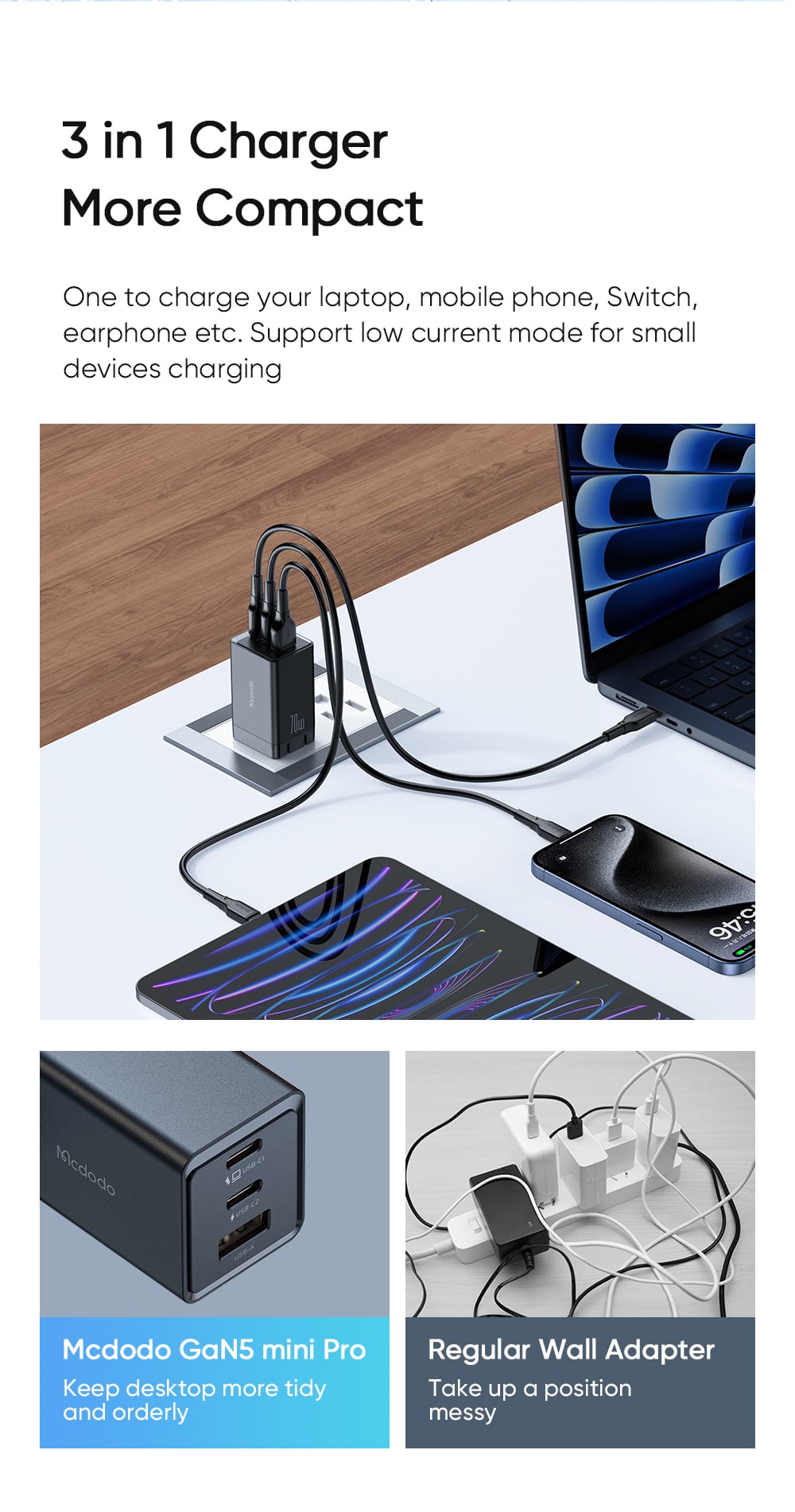Mcdodo CH-151 thuộc dòng sản phẩm GaN5 Mini Pro cao cấp nhất hiện nay của Mcdodo. Đây là giải pháp "All-in-One" hoàn hảo cho người dùng đa thiết bị, giúp bạn loại bỏ hoàn toàn những bộ sạc cồng kềnh, nặng nề để tận hưởng sự gọn nhẹ và tiện lợi tối đa.