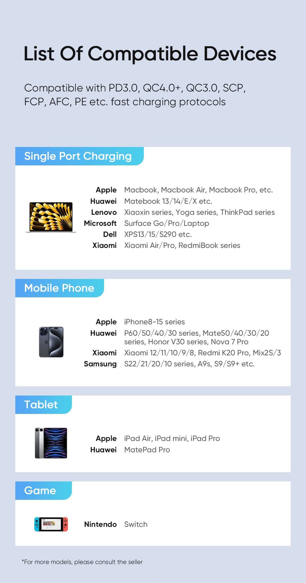 - SCP, FCP, AFC: Sạc nhanh cho Huawei, OPPO (một số dòng).
