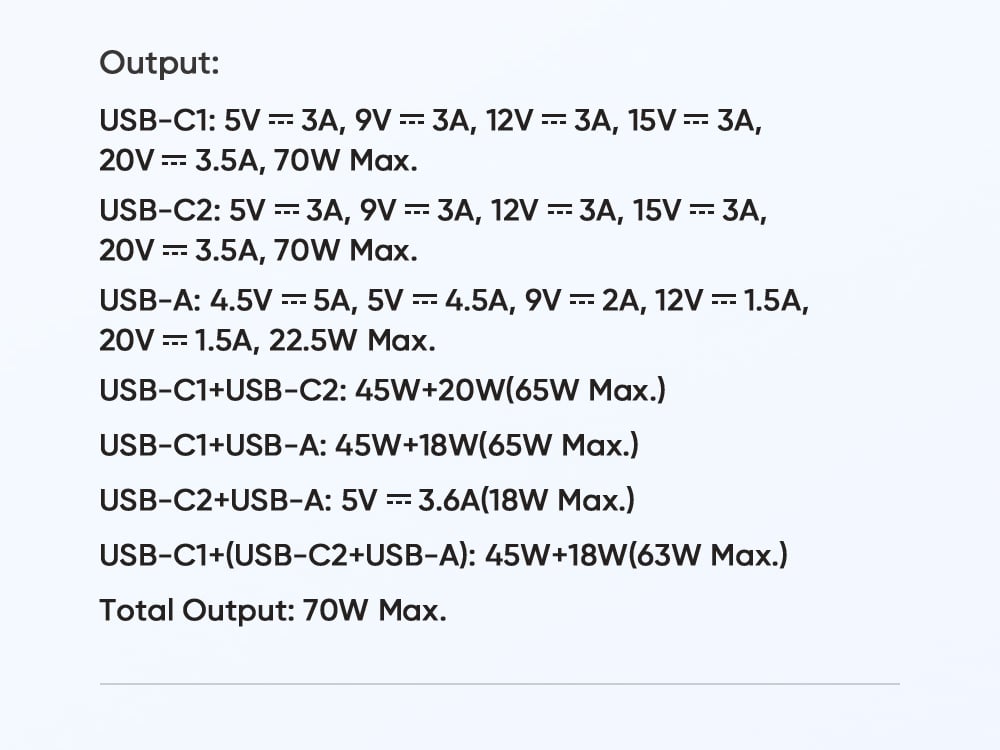 USB-C1+(USB-C2+USB-A): 45W+18W(63W Max.)