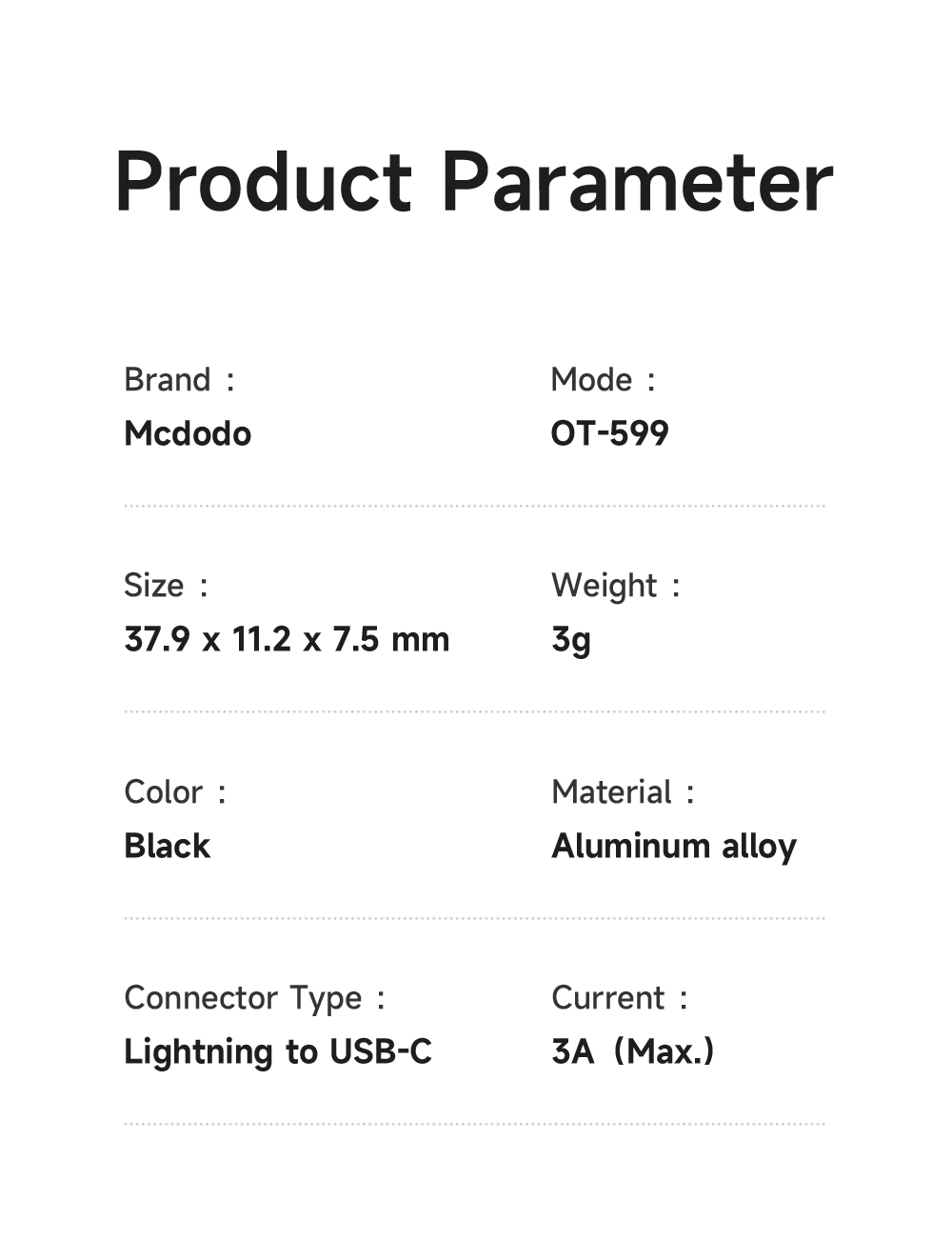 Series Name: Wales Series Product Name: Lightning to USB-C 36W Connector Material: Aluminum alloy Brand: Mcdodo Mode: OT-599 Size: 37.9 x 11.2 x 7.5 mm Weight: 3g Color: Black Material: Aluminum alloy Connector Type: Lightning to USB-C Current: 3A (Max.)