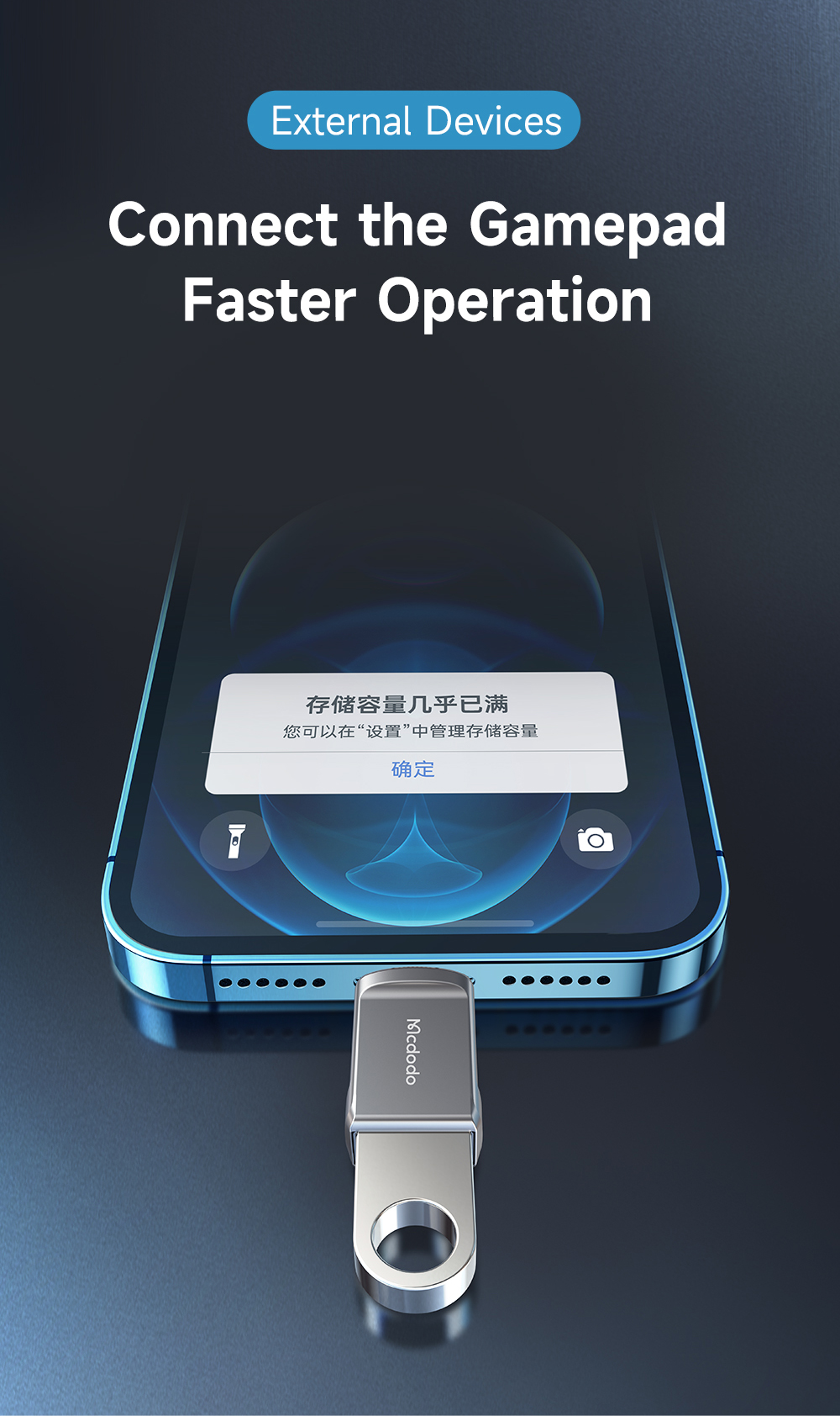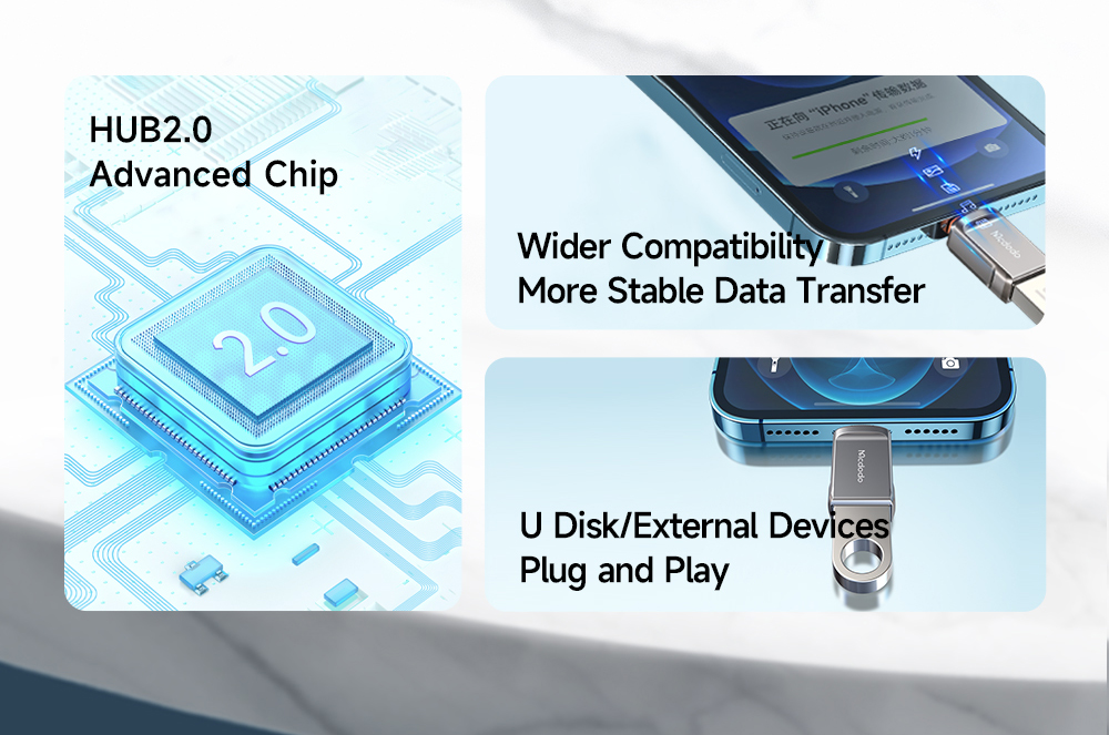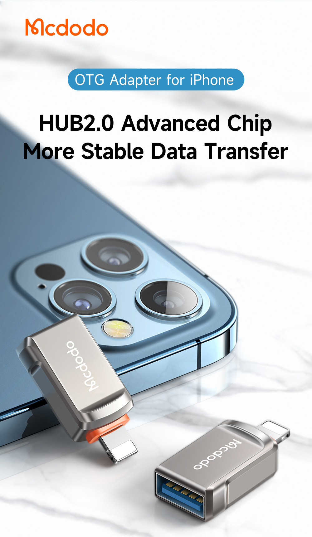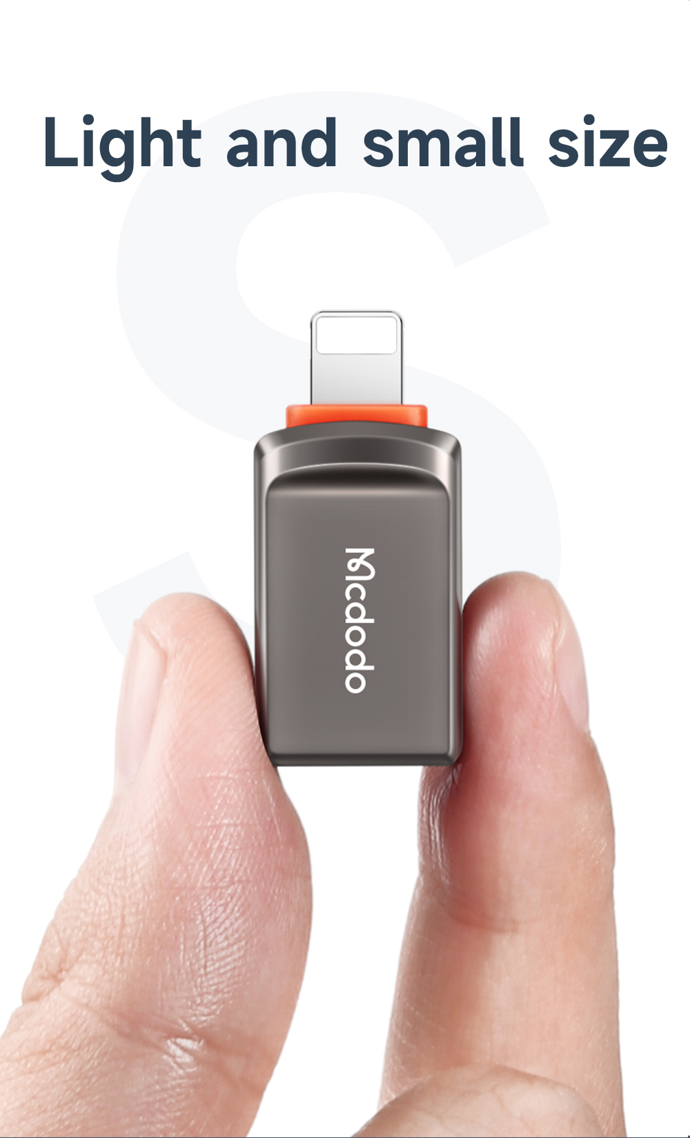 Đến từ thương hiệu phụ kiện uy tín Mcdodo, thiết bị nhỏ gọn này cho phép bạn kết nối trực tiếp các thiết bị ngoại vi sử dụng cổng USB-A (như chuột, bàn phím, tay cầm chơi game, USB lưu trữ,...) vào cổng Lightning của iPhone hoặc iPad.