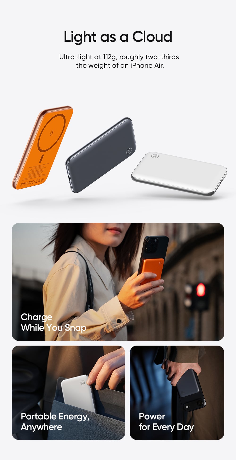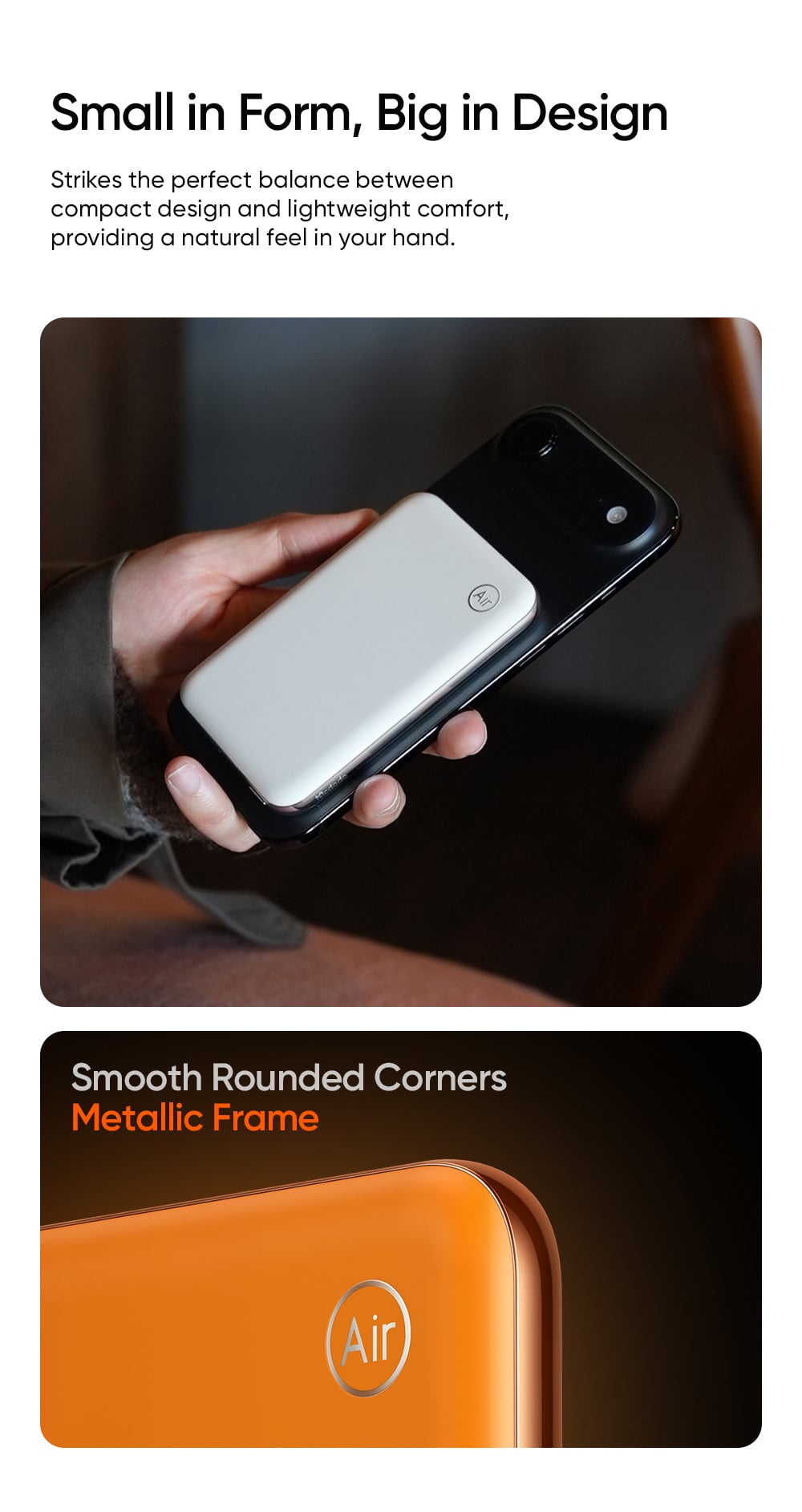 Điểm ấn tượng nhất của dòng MetaAir chính là độ mỏng kinh ngạc chỉ 10.6mm và trọng lượng siêu nhẹ 116g. Với kích thước chỉ tương đương một chiếc thẻ sạc, bạn có thể dễ dàng gắn pin vào mặt lưng điện thoại mà không gây cảm giác nặng nề hay vướng víu khi cầm nắm hoặc bỏ vào túi quần.