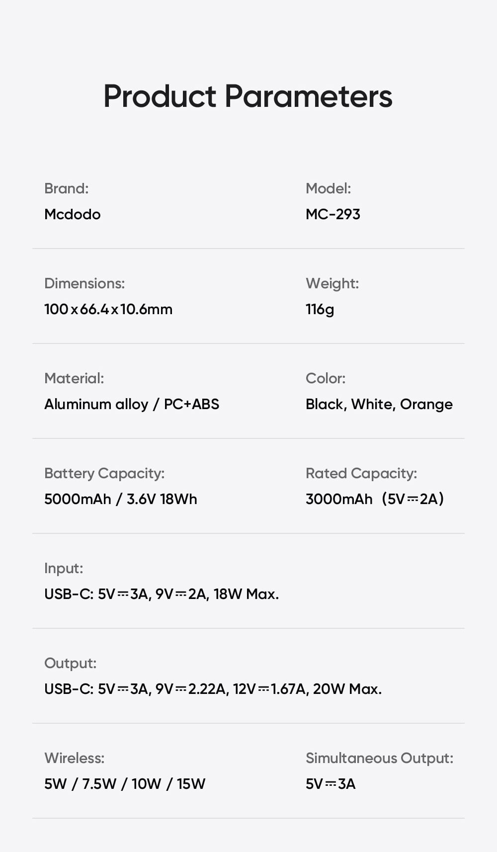 Simultaneous Output: USB-C + Wireless: 10W + 5W, 15W Max.