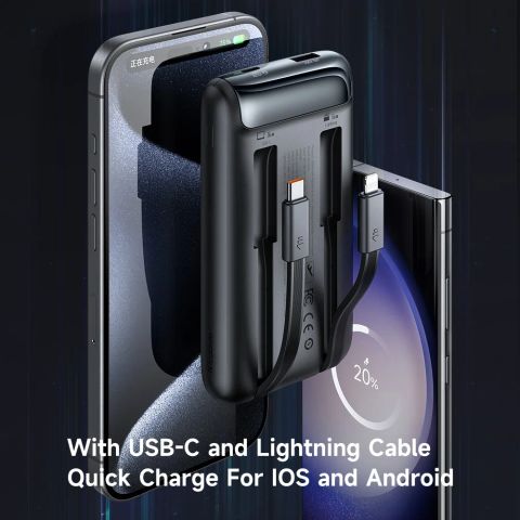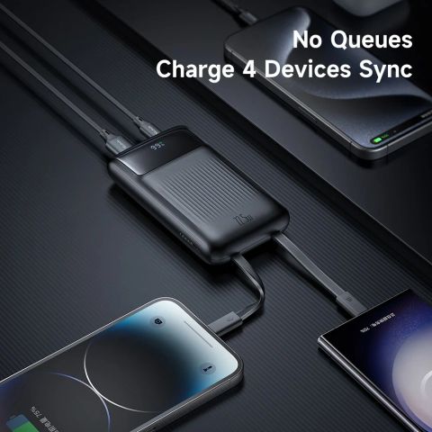 4 Cổng ra (Output): Bao gồm 2 cáp có sẵn + 1 cổng USB-A + 1 cổng Type-C. Bạn có thể sạc cùng lúc cho điện thoại, máy tính bảng, tai nghe và đồng hồ thông minh mà không cần chờ đợi.